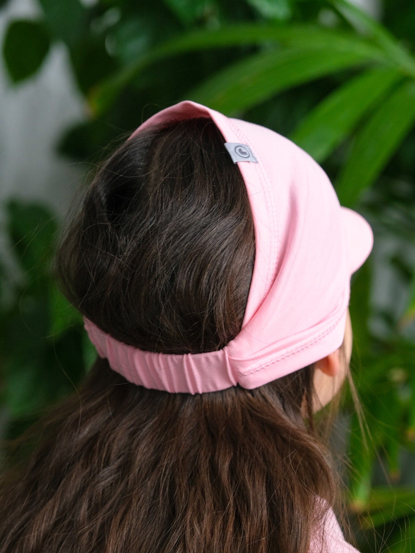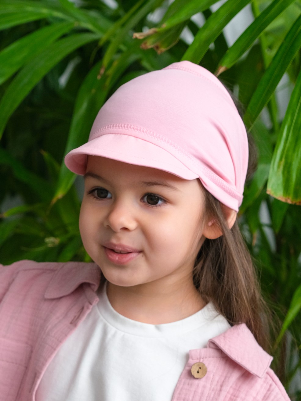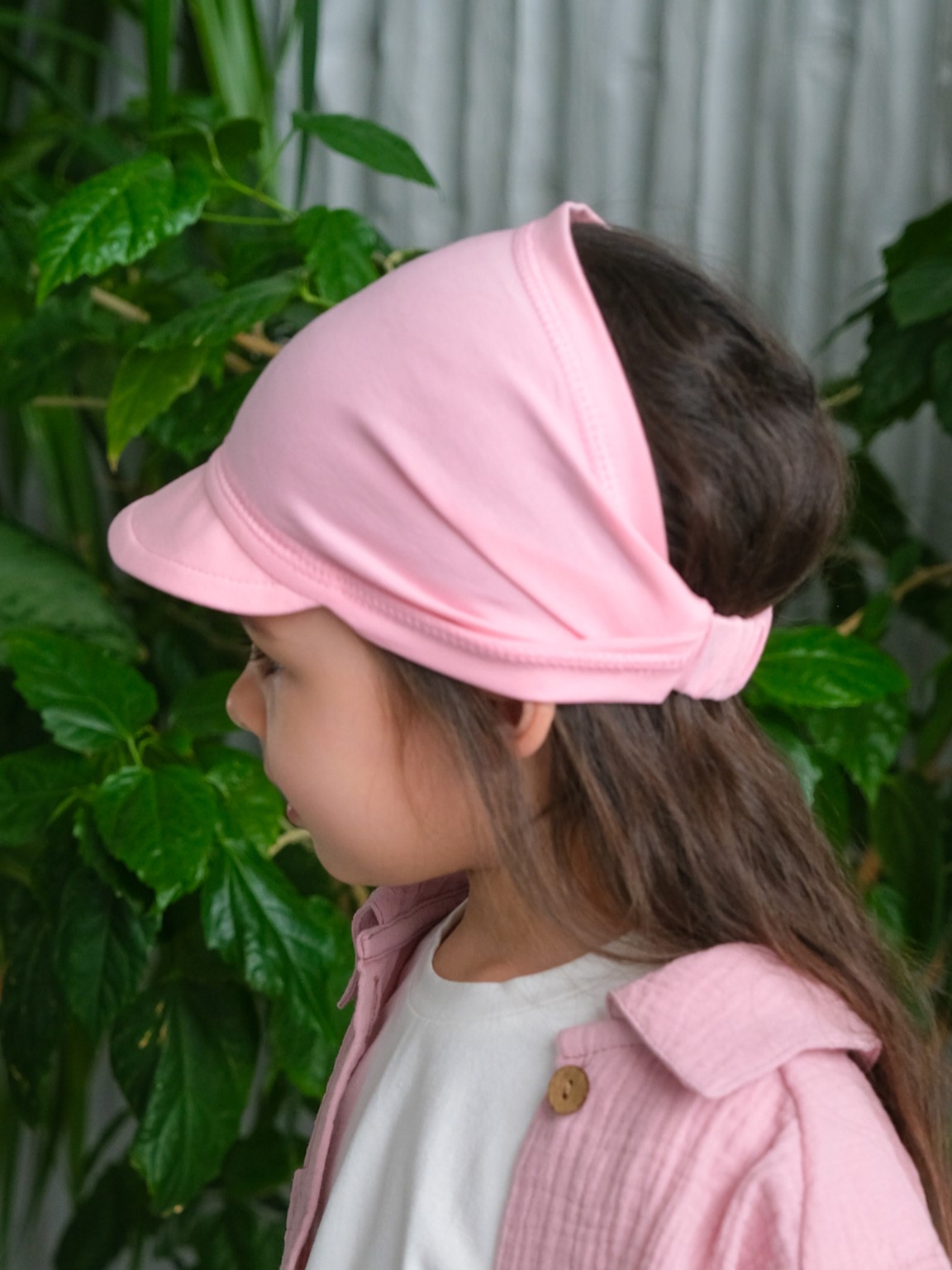 Детская косынка с козырьком на резинке для девочки от 1 года до 7 лет. Легкая и тонкая пляжная повязка прямоугольного кроя надежно защитит голову ребенка от палящего летнего солнца.