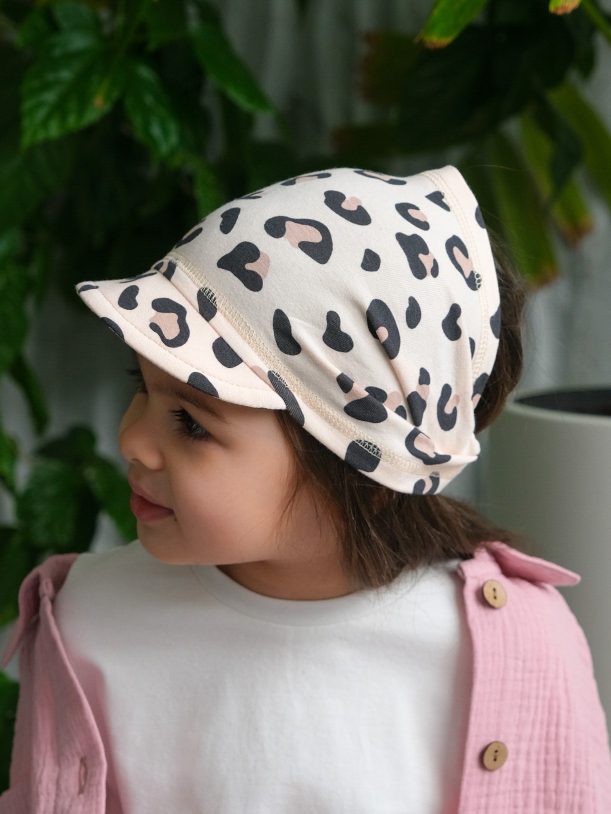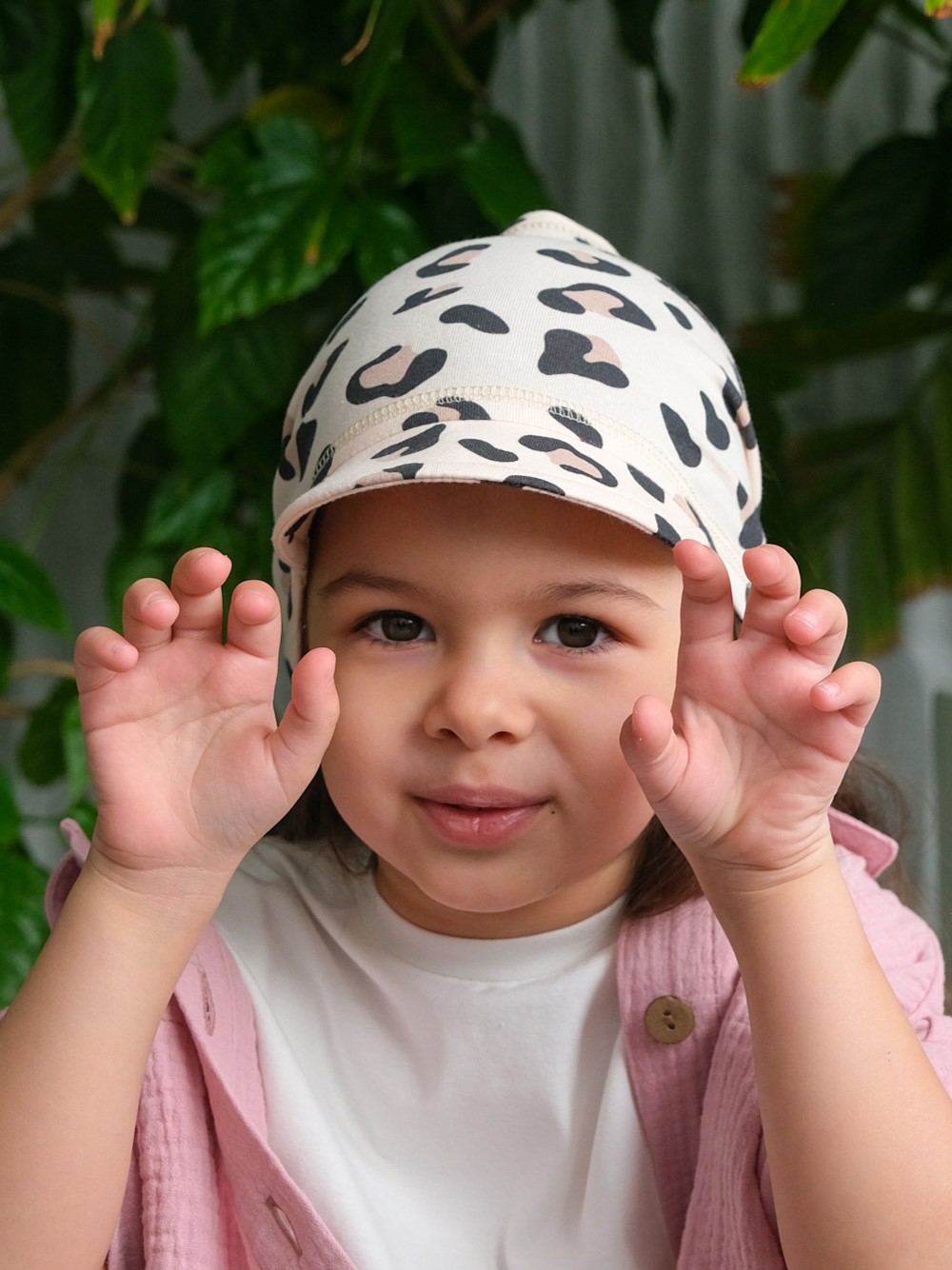 Детская косынка с козырьком на резинке для девочки от 1 года до 7 лет. Легкая и тонкая пляжная повязка прямоугольного кроя надежно защитит голову ребенка от палящего летнего солнца.