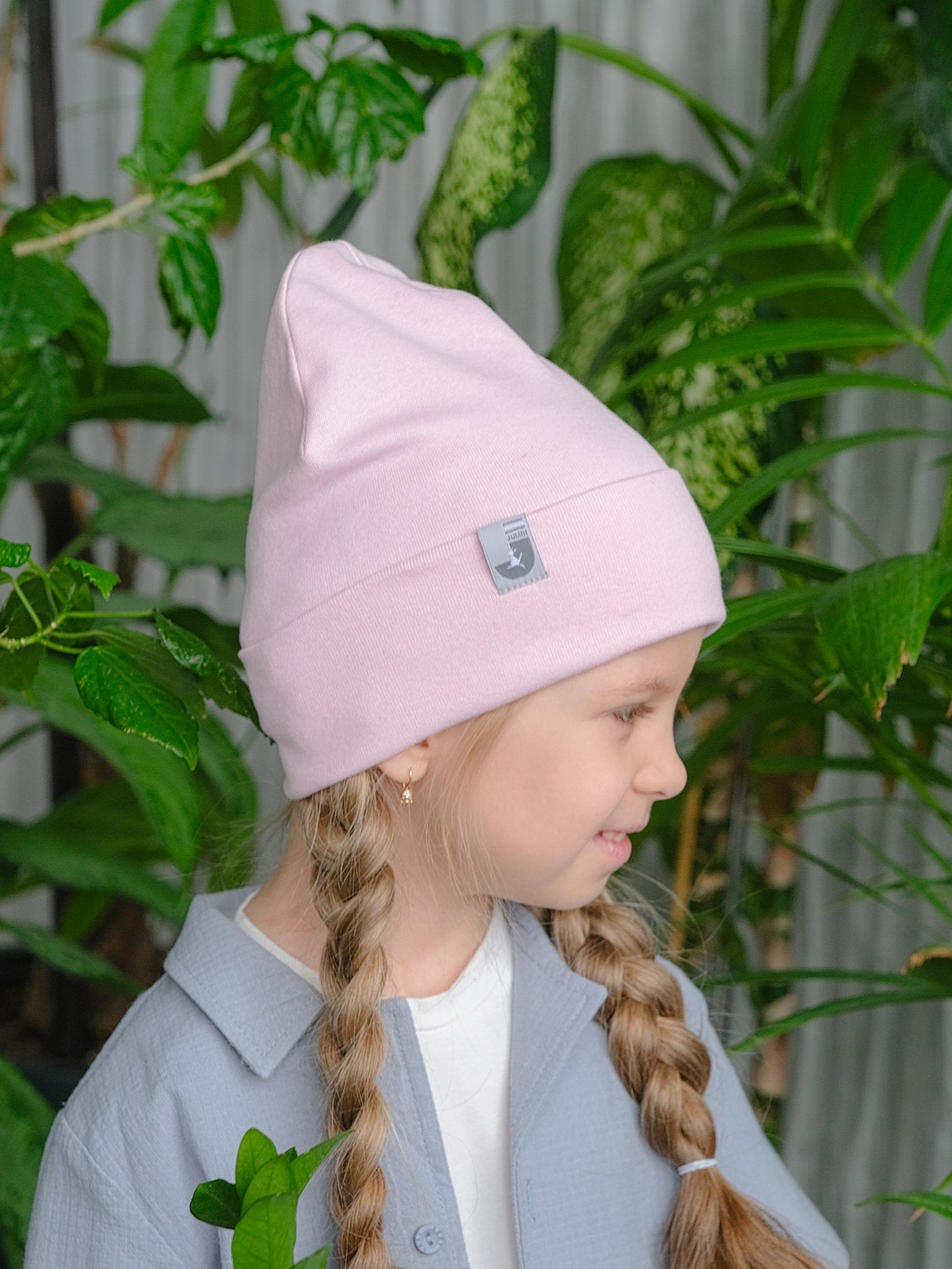 Шапочка двухслойная, с широким отворотом, вытянутой формы бини. Украшена аккуратным фирменным шевроном Jumbi. Шапка тонкая весенняя для девочки аккуратно сидит по голове, отворот защищает голову малыша в ветреную погоду осенью, весной и прохладным летом.