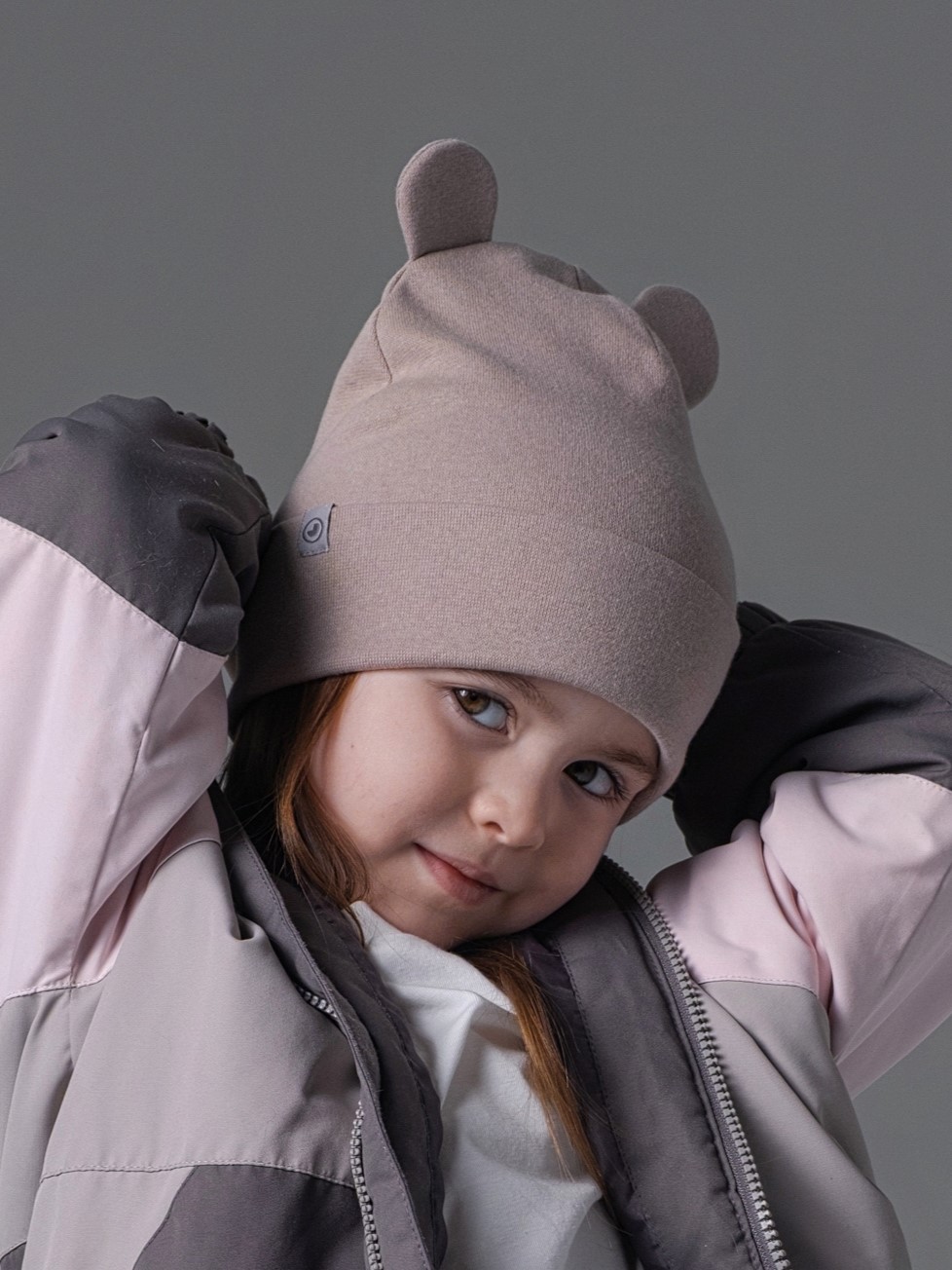 Шапочка двухслойная, с широким отворотом, вытянутой формы бини. Украшена ушками и аккуратным фирменным шевроном Jumbi. Шапка тонкая весенняя для девочки, мальчика аккуратно сидит по голове, отворот защищает голову малыша в ветреную погоду осенью, весной и прохладным летом.