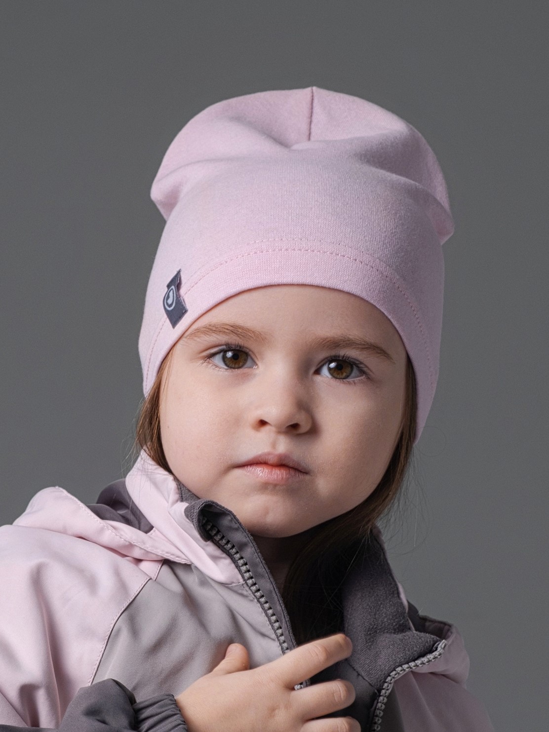 Шапочка однослойная, вытянутой формы бини. Украшена аккуратным фирменным шевроном Jumbi. Шапка тонкая весенняя для девочки аккуратно сидит по голове, защищает голову малыша в ветреную погоду осенью, весной и прохладным летом.