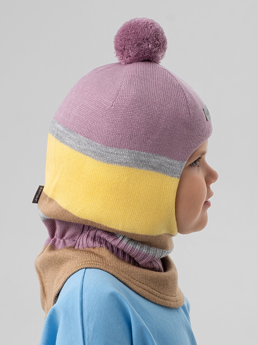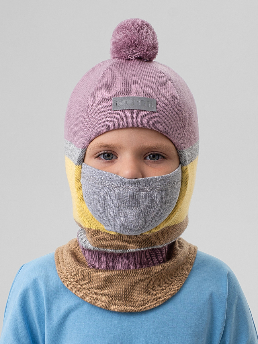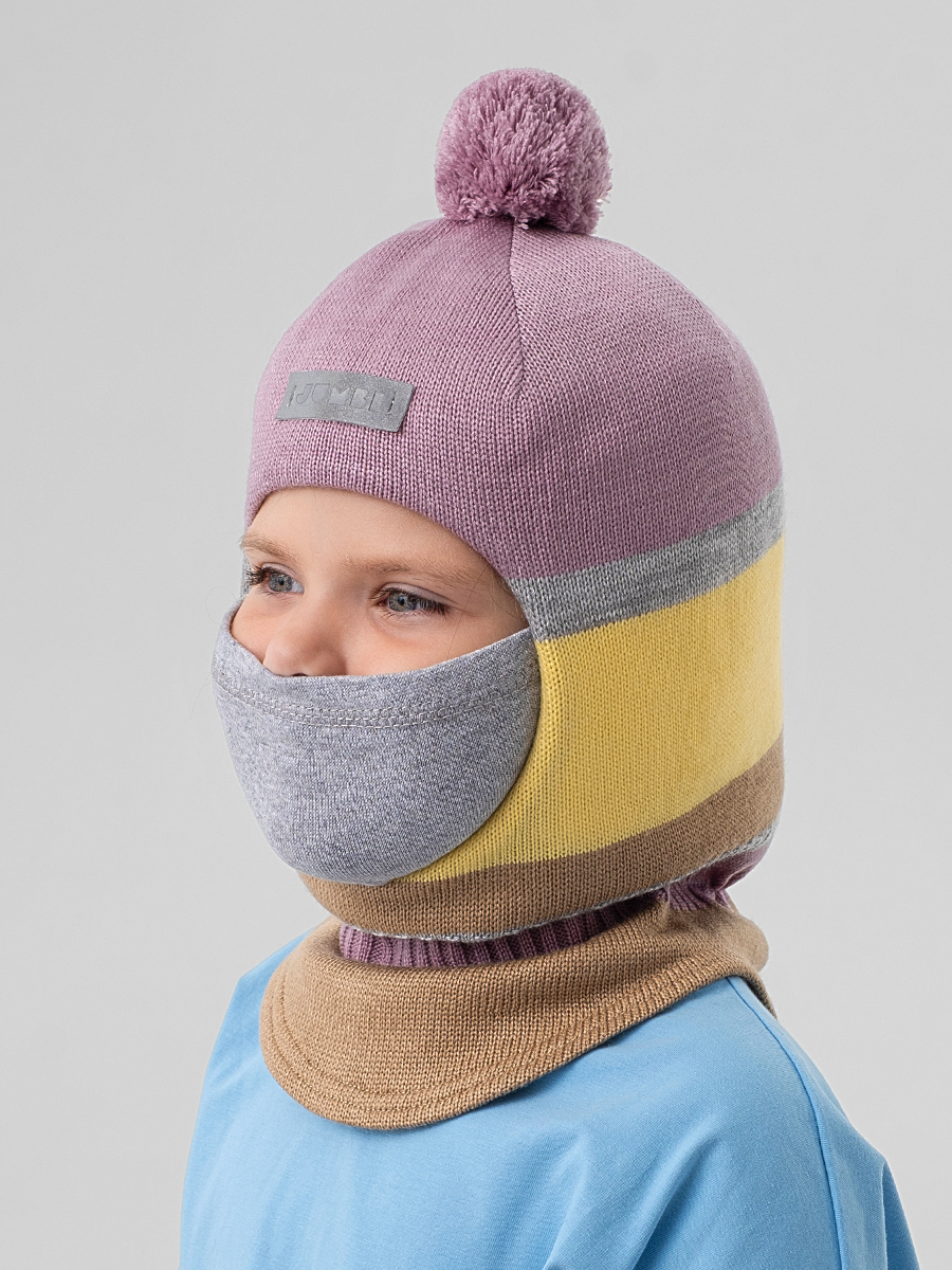 Зимняя шапка шлем для девочки исполнена в очаровательной расцветке "Клеверная дымка", украшена ниточным помпоном (не снимается) и оснашена маской, закрывающей нижнюю часть лица от непогоды. Масочка пришита, при необходимости можно убрать под подбородок. Детский головной убор обеспечит тепло и уют во время прогулок при температуре от -5 до -25 градусов (в зависимости от индивидуальной терморегуляции, погодных условий и времени пребывания на улице).