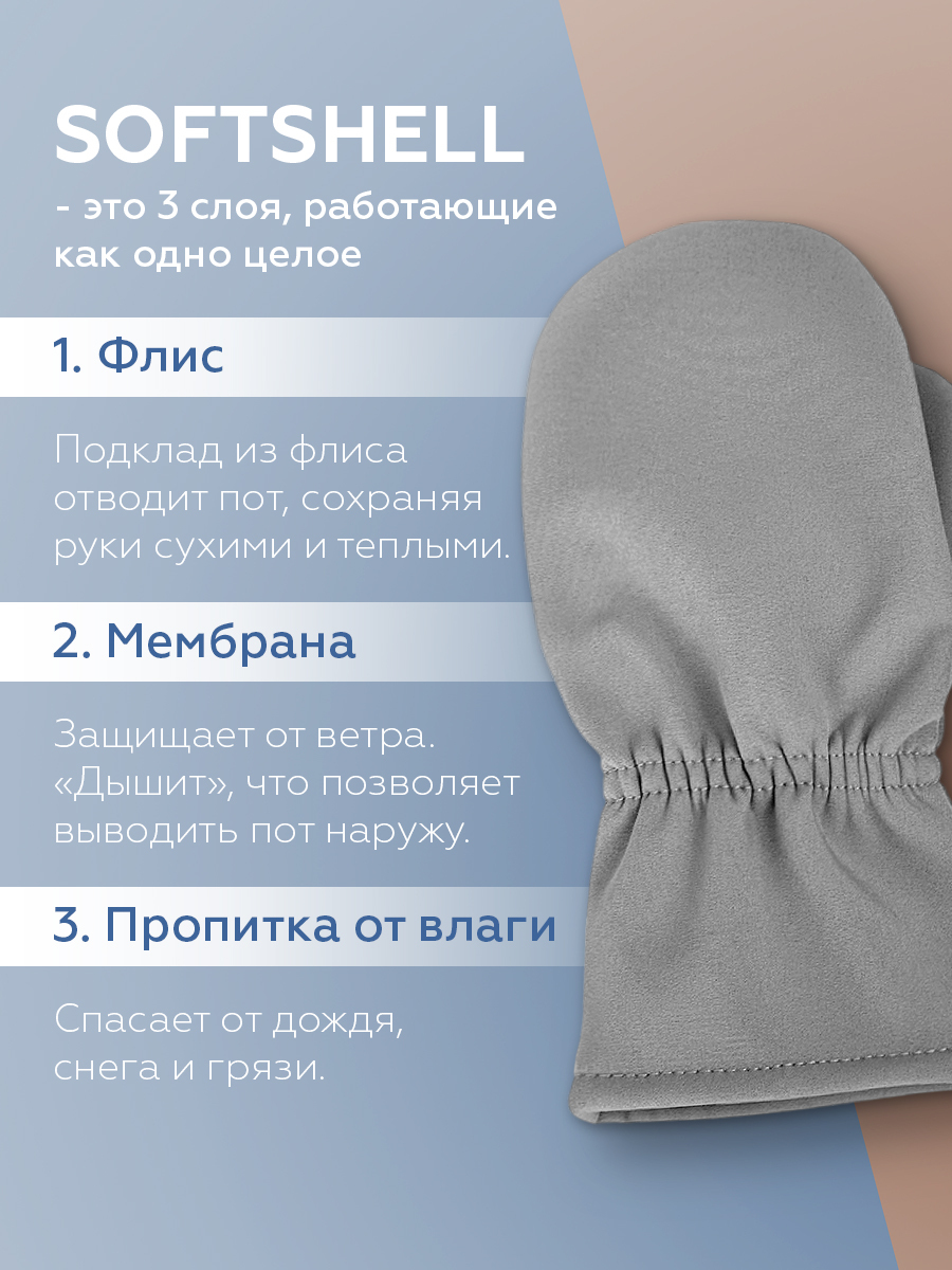Варежки детские осенние - весенние из материала softshell объединяют в себе сразу 3 важные функции: сохраняют тепло, отводят пот, защищают от ветра и влаги. Рукавицы имеют температурный режим: осень-весна от +10 до 0 градусов. Softshell (софтшелл) - это легкий высокотехнологичный материал на основе мембраны и флиса. Состоит из 3-ех слоев: 1 Внутреннего – флис. Сохраняет тепло внутри рукавичек за счет того, что НЕ впитывает, а отводит пот, который впоследствии выходит через мембрану. Руки ребенка остаются сухими даже во время активных игр. Варежки на флисе детские теплые и очень комфортные в носке. Кроме того, флис обладает высокой износостойкостью и не линяет. 2 Среднего – мембрана. Обеспечивает надежную ветрозащиту, а также хорошо «дышит», что позволяет выводить пот наружу. 3 Верхнего - влагоотталкивающая пропитка. Спасает от дождя, снега и грязи. Важно отметить, что софтшелл – дышащий НЕ 100% водонепроницаемый материал, но при этом он может хорошо удерживать влагу на протяжении долгого времени. Швы не проклеены. Демисезонные варежки для девочки и мальчика продуманы с учетом комфорта и удобства. Резинка на запястье обеспечивает надежную фиксацию рукавиц и препятствует задуванию ветра. Удлиненные манжеты легко заправить под куртку. Также варежки краги детские оснащены вшитой резиночкой, которая позволяет повесить их на руку.